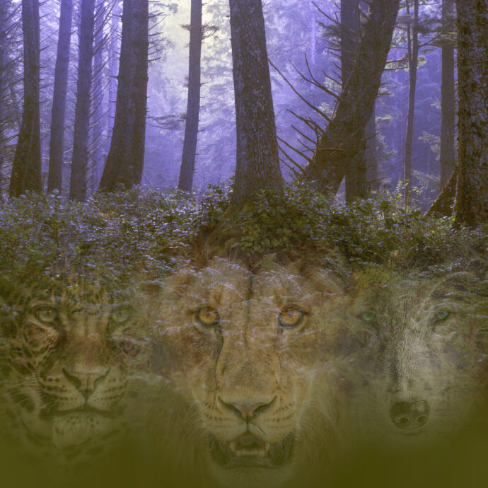 vividly portrays the dark knarled wood of Dante’s first words in the Divine Comedy [note the Aslan-type creature at the bottom of her image, recalling Revelation’s “Do not weep, the Lion of the tribe of Judah, the Root of David has won the right by his victory to open the scroll with the seven seals“]